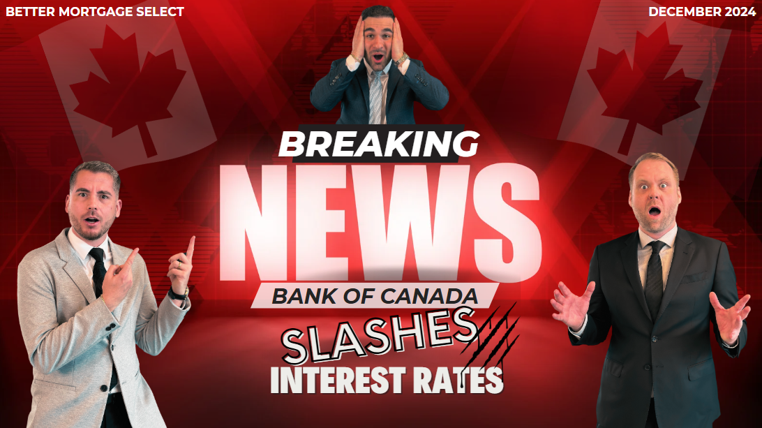 | | | | | | Better Mortgage Select presents: Breaking interest rate news, brought to you by Daniel Patton, Michael Zanzini, Lorenzo Podda, and our President, Dave Butler. | | | | | | | | The Bank of Canada held its final interest rate meeting of the year this morning and concluded 2024 with a bang, announcing a JUMBO 0.50% cut to the key interest rate.