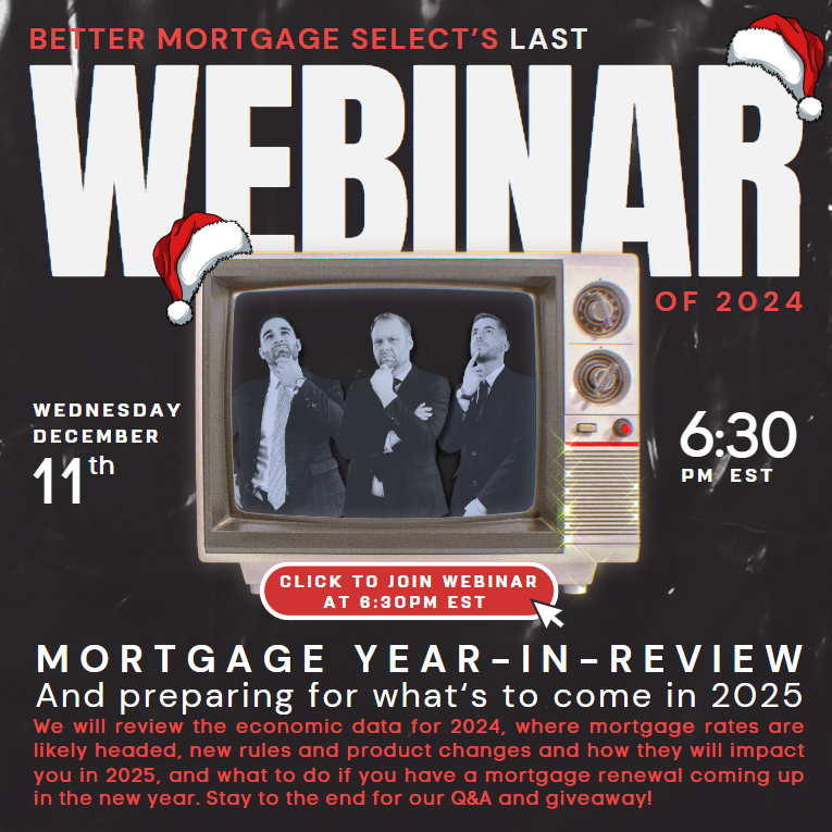 We’re here to help you navigate these opportunities. If you’d like to discuss locking into a low fixed rate, renewing, or refinancing, email us at info@bmselect.ca, and we’ll help craft the best strategy for your needs. | | | | | | | | | | Join us for our last webinar of the year, TONIGHT! Mortgage Year in Review and Preparing for 2025 Tonight at 6:30PM EST We’ll discuss today’s JUMBO rate cut, what it means for 2025, and more. Click the image below to join the webinar tonight at 6:30PM EST, or use the following link: https://us02web.zoom.us/j/7436519435 | | | | | | | | | | | | | | | | Our December newsletter will include: - Predictions from Dan, Mike, Lorenzo, and Dave for 2025 interest rates